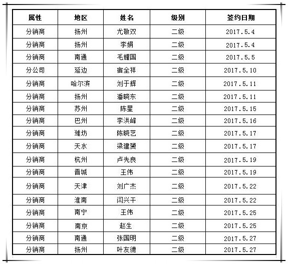 【國泰訊】5月31日,自集團(tuán)營銷中心最新數(shù)據(jù)顯示,進(jìn)入五月以來,公司渠道開發(fā)又出新成績,新增簽約合作伙伴18家。他們分別來自揚州、南通、延邊、哈爾濱、蘇州、巴州、濰坊、天水、南寧、晉城、天津、淮南、杭州、江蘇等,至此國泰集團(tuán)渠道的開拓工作又登上了一個新的臺階!