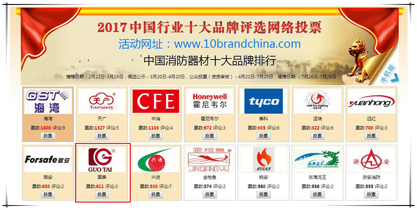 近日,在由“品牌排行網(wǎng)”主辦的2017中國行業(yè)十大品牌評選活動中,我們國泰品牌踴躍參與到中國消防器材行業(yè)十大品牌的角逐中,目前已經(jīng)入圍前十名。