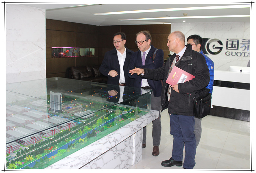 【圖為Mr.Maffei(馬菲先生)一行參觀國泰消防產(chǎn)業(yè)園沙盤模型】