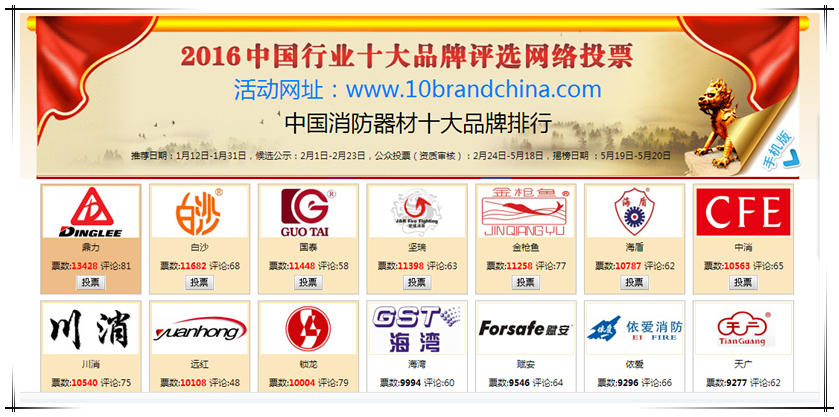 近日,在由“品牌排行網(wǎng)”主辦的2016中國行業(yè)十大品牌評選活動中,我們國泰品牌踴躍參與到中國消防器材行業(yè)十大品牌的角逐中,目前已經(jīng)排到了第三名。這是繼我們在2015年12月份獲得2015年度中國可攜式滅火器行業(yè)十大品牌殊榮后的又一準(zhǔn)榮譽(yù)。