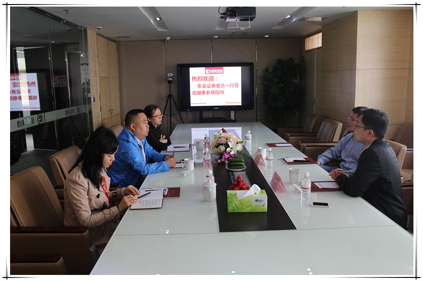 本次會上,王根彬先生首先對東吳證券董總一行的蒞臨表示熱烈歡迎。隨后,簡單介紹了集團發(fā)展現(xiàn)狀及國泰人防掛牌上市情況,并進一步闡述了推進國泰其他產業(yè)同步上市的想法。在了解前面幾次的溝通的情況匯總的同時,王總著重提出:2016年,國泰集團希望借助國泰人防上市的東風,逐步推進集團其他產業(yè)上市。