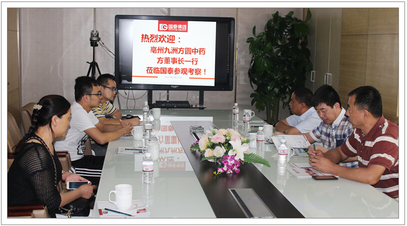 【國泰訊】9月17日下午,中藥龍頭企業(yè)安徽九洲方圓集團董事方總、房產(chǎn)中心成本合約部總監(jiān)郭總、工程中心肖總一行蒞臨國泰集團參觀考察,集團發(fā)展中心總監(jiān)吳劍、集團亳州分公司王總等領(lǐng)導(dǎo)對方總一行的到來,進行了熱情的接待,雙方在集團7樓會議中心就九洲方圓電商物流城建設(shè)項目中,關(guān)于消防工程及消防器材采購的事宜進行了深入溝通與洽談。